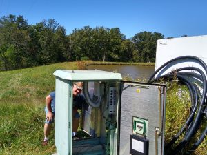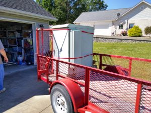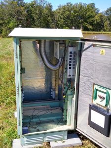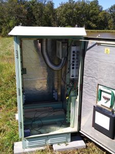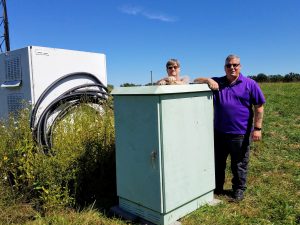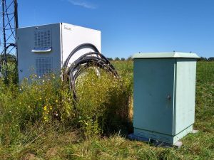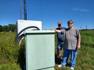 With the help of Allan Sieker (AD0FT) and Jim Cleveland (KD0HXG) today, we moved the cabinet into place for the N0NOE-N repeater. Thanks Alan and Jim! Could not have done it without you! Oh, and a very special thanks to Jay Gallagher (N0VHN) for providing the site and for bringing his tractor back to the tower to help unload the cabinet from the trailer. Wiring for power and antenna connection is next, then we’ll be ready to go on the air!
